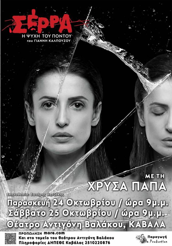 Η παράσταση "Σέρρα-Η ψυχή του Πόντου", βασισμένη στο ομώνυμο μυθιστόρημα του Γιάννη Καλπούζου, με την εξαιρετική ερμηνεία της Χρύσας Παπά, μετά τις sold out παραστάσεις του περασμένου Οκτώβρη και Ιανουαρίου, επιστρέφει στην Καβάλα για δύο τελευταίες παρουσιάσεις, την Παρασκευή 24 και το Σάββατο 25 Οκτωβρίου στις 21.00, στο Θέατρο Αντιγόνη Βαλάκου.