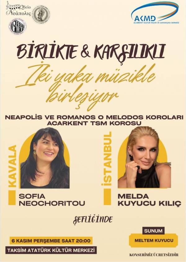 Μετά τη συναυλία "ΜΑΖΙ ΚΙ ΑΝΤΙΚΡΙΣΤΑ" που είχαν δώσει στις 24 Μαΐου, στο Ακόντισμα της Νέας Καρβάλης (δείτε εδώ) η Σοφία Νεοχωρίτου και η Melda Kuyucu Kiliç, θα δώσουν μία νέα συναυλία στις 6 Νοεμβρίου, αυτή τη φορά στην Κωνσταντινούπολη.