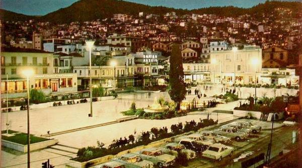 Δυτικά της πλατείας φωτισμένο το ξενοδοχείο ΑΣΤΗΡ με την είσοδο υποδοχής και το εστιατόριο στα αριστερά, δεξιά ήταν το κατάστημα της Εθνικής Τραπέζης.