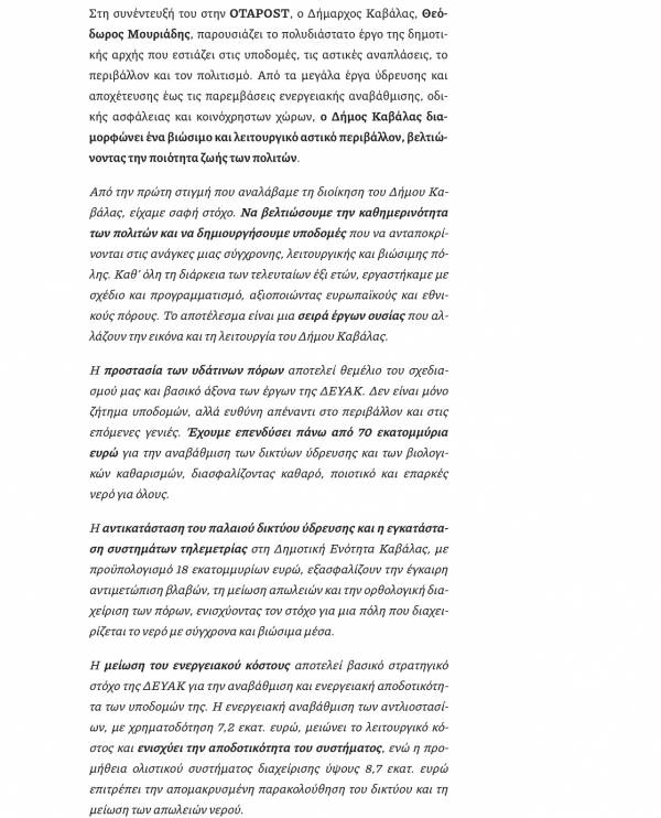 Στη συνέντευξή του στην OTAPOST, ο Δήμαρχος Καβάλας, Θεόδωρος Μουριάδης, παρουσιάζει το πολυδιάστατο έργο της δημοτικής αρχής που εστιάζει στις υποδομές, τις αστικές αναπλάσεις, το περιβάλλον και τον πολιτισμό. Από τα μεγάλα έργα ύδρευσης και αποχέτευσης έως τις παρεμβάσεις ενεργειακής αναβάθμισης, οδικής ασφάλειας και κοινόχρηστων χώρων, ο Δήμος Καβάλας διαμορφώνει ένα βιώσιμο και λειτουργικό αστικό περιβάλλον, βελτιώνοντας την ποιότητα ζωής των πολιτών.