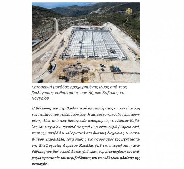 Η βελτίωση του περιβαλλοντικού αποτυπώματος αποτελεί ακόμη έναν πυλώνα του σχεδιασμού μας. Η κατασκευή μονάδας προχωρημένης ιλύος από τους βιολογικούς καθαρισμούς των Δήμων Καβάλας και Παγγαίου, προϋπολογισμού 12,9 εκατ. ευρώ (Ταμείο Ανάκαμψης), συμβάλλει καθοριστικά στη βιώσιμη διαχείριση των αποβλήτων. Παράλληλα, έργα όπως ο εκσυγχρονισμός της Εγκατάστασης Επεξεργασίας Λυμάτων Καβάλας (4,8 εκατ. ευρώ) και η αναβάθμιση του βιολογικού Δάτου (9,6 εκατ. ευρώ) ενισχύουν τον στόχο για προστασία του περιβάλλοντος και του υδάτινου πλούτου της περιοχής.
