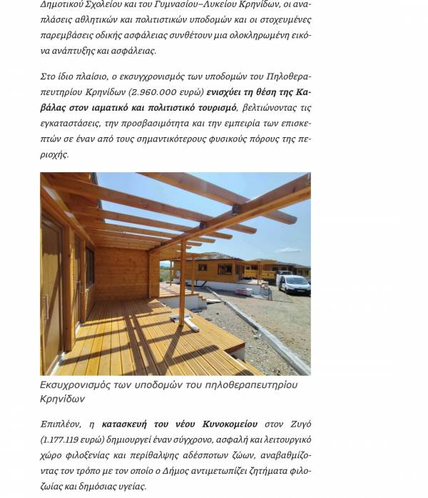 Στο ίδιο πλαίσιο, ο εκσυγχρονισμός των υποδομών του Πηλοθεραπευτηρίου Κρηνίδων (2.960.000 ευρώ) ενισχύει τη θέση της Καβάλας στον ιαματικό και πολιτιστικό τουρισμό, βελτιώνοντας τις εγκαταστάσεις, την προσβασιμότητα και την εμπειρία των επισκεπτών σε έναν από τους σημαντικότερους φυσικούς πόρους της περιοχής.