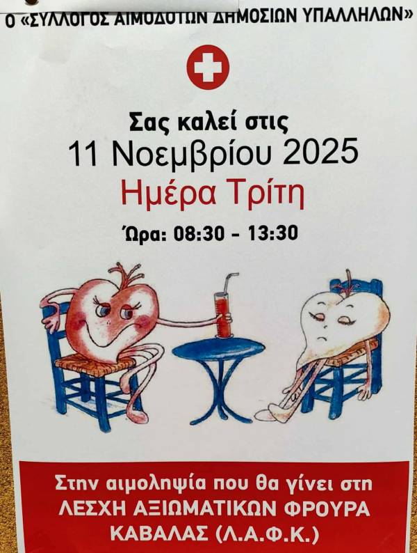 Ο «Σύλλογος Αιμοδοτών Δημοσίων Υπαλλήλων», θα έχει αιμοληψία την Τρίτη 11 Νοεμβρίου.