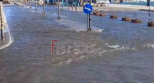 Το οδόστρωμα και το πάρκινγκ του λιμανιού πλημμύρισαν, μετατρέποντας την περιοχή σε μια ενιαία υδάτινη επιφάνεια, λόγω του έντονου κυματισμού.