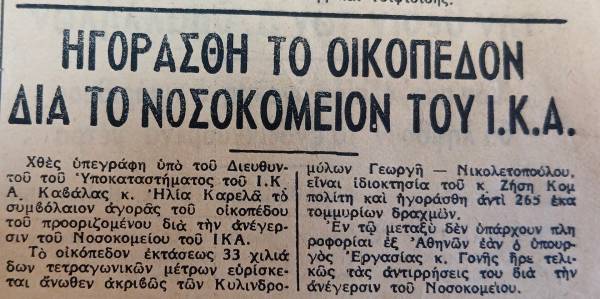 Το τίμημα για την αγορά του οικοπέδου ήταν 265 εκατομμύρια δραχμές. Στον τοπικό τύπο της εποχής (στην φωτογραφία δημοσίευμα της εφημερίδος “ΤΑΧΥΔΡΟΜΟΣ”) υπήρχαν πολλές απόψεις για την κίνηση της αγοράς αυτής αλλά και ανησυχία αν τελικά το ΙΚΑ θα πραγματοποιήσει την υπόσχεση του για την ανέγερση και λειτουργία Νοσοκομείου…