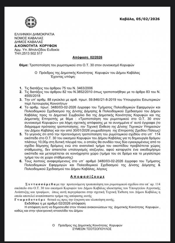 Η Δημοτική Κοινότητα Κορυφών συντάσσεται με την προτεινόμενη τροποποίηση του ρυμοτομικού σχεδίου στο υπ’ αρ. 114 οικόπεδο του Ο.Τ.30 του οικισμού Κορυφών του Δήμου Καβάλας, ιδιοκτησίας του Υπουργείου Αγροτικής Ανάπτυξης και Τροφίμων, όπως αυτή περιγράφεται στη σχετική Τεχνική Έκθεση του Δήμου Καβάλας, η οποία αποτελεί αναπόσπαστο τμήμα της απόφασης.