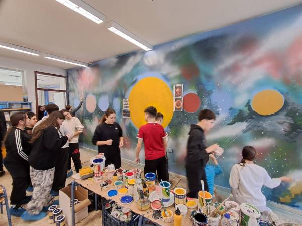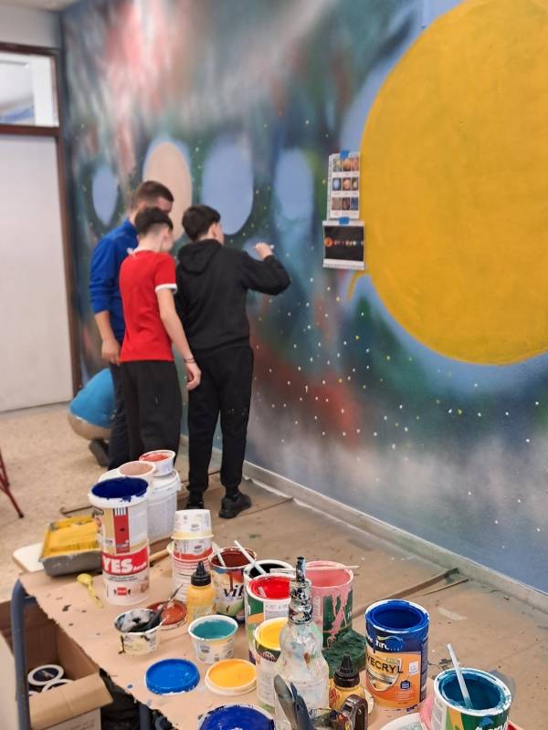 Ο Καβαλιώτης εικαστικός μαζί με τους μαθητές και τους γονείς ζωγράφισαν τους πλανήτες, μία Δύση του ήλιου και ένα τοπίο.