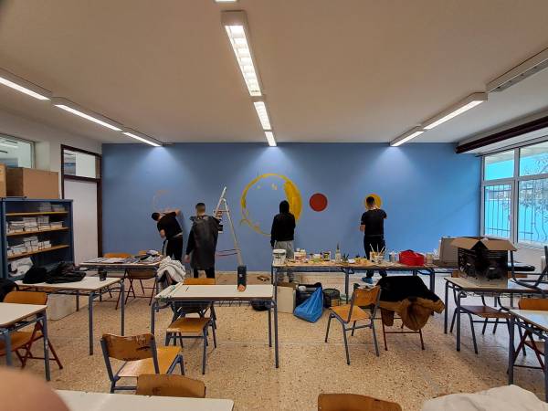 Ο Γιάννης Κανίογλου με μαθητές και γονείς των Β1 και Β2 του Γυμνασίου Λιμένα ζωγράφισαν τρεις αίθουσες του σχολείου.