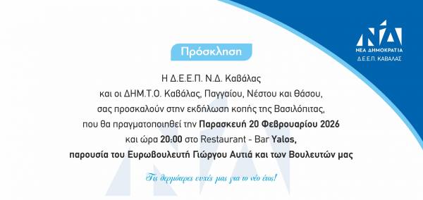 «Η Δ.Ε.Ε.Π. Καβάλας και οι ΔΗΜ.ΤΟ. Καβάλας, Θάσου, Νέστου και Παγγαίου της Νέας Δημοκρατίας, προσκαλούν όλα τα μέλη και τους φίλους στην εκδήλωση κοπής Βασιλόπιτας.