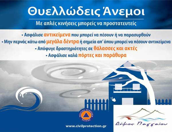 Το Τμήμα Πολιτικής Προστασίας του Δήμου Παγγαίου προειδοποιεί τους κατοίκους της περιοχής να λάβουν τα απαραίτητα μέτρα προστασίας καθώς σύμφωνα με το δελτίο αναγγελίας θα πνέουν Νότιοι Νοτιοδυτικοί θυελλώδεις άνεμοι εντάσεως 7-8 Μποφόρ για σήμερα Παρασκευή 20/2/2026.