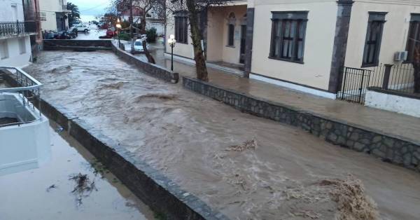 Οι δρόμοι στο επαρχιακό δίκτυο, ρέματα αλλά και μεγάλες αγροτικές εκτάσεις έχουν πλημμυρίσει επίσης.