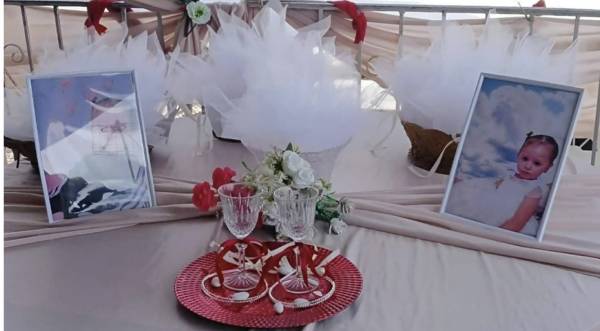 Η οικογένεια αποχαιρέτησε το μικρό αγγελούδι με μπομπονιέρες, λευκά και ροζ τούλια και ανθοδέσμες με τριαντάφυλλα.