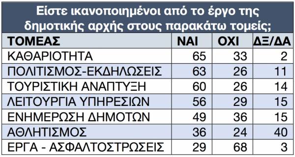 Η δημοσκόπηση καταγράφει μεγάλα ποσοστά ικανοποίησης για το έργο της δημοτικής αρχής (κοντά στο 60%) με περίπου 2 στους 3 πολίτες να δηλώνουν ικανοποίηση για τους τομείς καθαριότητας και εκδηλώσεων. Μεγάλα ποσοστά ικανοποίησης (κοντά στο 60%) καταγράφονται στους τομείς τουριστικής ανάπτυξης και λειτουργίας των υπηρεσιών ενώ οι πιο χαμηλές επιδόσεις καταγράφονται στους τομείς αθλητισμού και έργων. Σχεδόν οι μισοί δηλώνουν ικανοποιημένοι από το επίπεδο ενημέρωσης των δημοτών.