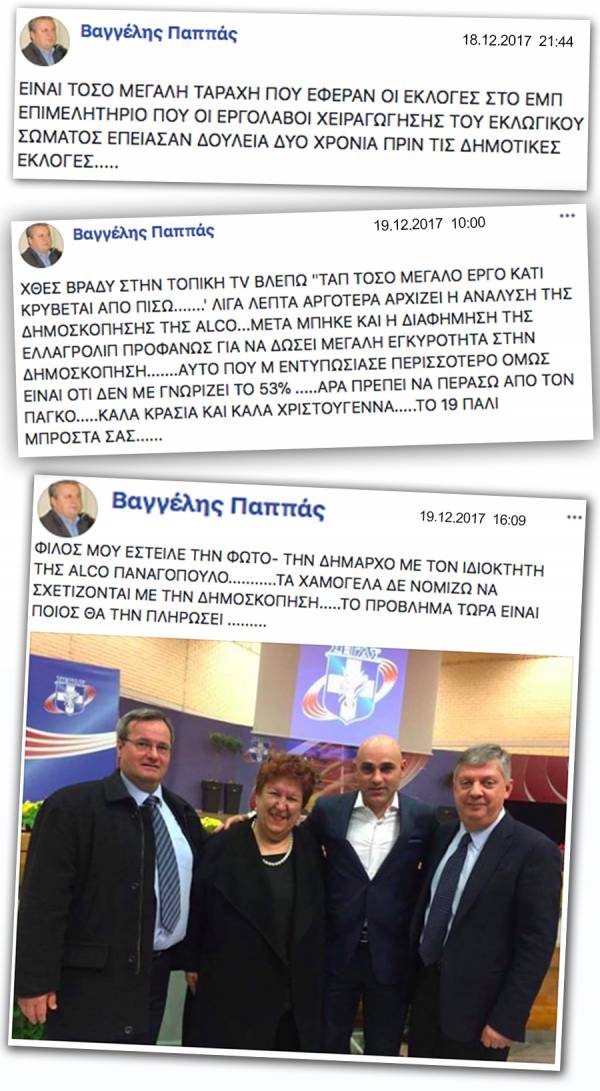 Ο Βαγγέλης Παππάς πάντως επανήλθε με νέο σχόλιο το πρωί της Τρίτης 19 Δεκεμβρίου, στο οποίο αναφέρει: «χθες βράδυ στην τοπική TV βλέπω ΄ΤΑΠ, τόσο μεγάλο έργο, κάτι κρύβεται από πίσω’… λίγα λεπτά αργότερα αρχίζει η ανάλυση της δημοσκόπησης της ALCO… μετά μπήκε και η διαφήμιση της ΕΛΛΑΓΡΟΛΙΠ προφανώς για να δώσει μεγάλη εγκυρότητα στη δημοσκόπηση… Αυτό που μ’εντυπωσίασε περισσότερο όμως είναι ότι δεν με γνωρίζει το 53%... άρα πρέπει να περάσω από τον πάγκο… καλά κρασιά και καλά Χριστούγεννα… το 19 πάλι μπροστά σας…».