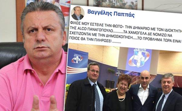 Ο Βαγγέλης Παππάς σχολιάζει: «φίλος μου έστειλε τη φωτό, την δήμαρχο με τον ιδιοκτήτη της Alco Παναγόπουλο… τα χαμόγελα νομίζω δεν σχετίζονται με τη δημοσκόπηση… το πρόβλημα τώρα είναι ποιος θα την πληρώσει…».