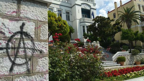 Πηγές από το δημαρχείο ανέφεραν ότι ήταν πέντε άνδρες που λίγο μετά τις 12:30 έγραψαν συνθήματα στο τοιχίο της αυλής του Δημαρχείου και σε τοίχο του κτιρίου.