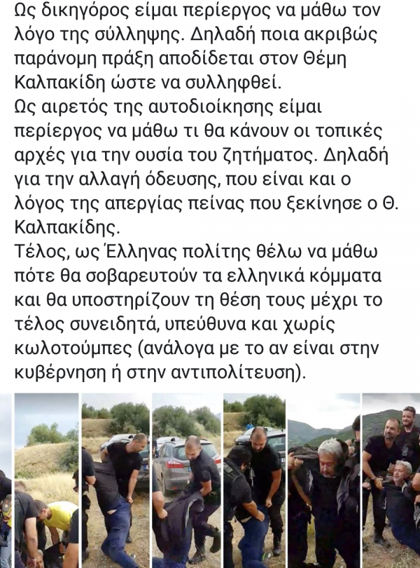 Με ανάρτηση του στα μέσα κοινωνικής δικτύωσης ο π. δήμαρχος και επικεφαλής της παράταξης "Καβάλα - Φίλιπποι ανοιχτή πόλη Κωστής Σιμιτσής έγραψε: " Ως δικηγόρος είμαι περίεργος να μάθω τον λόγο της σύλληψης. Δηλαδή ποια ακριβώς παράνομη πράξη αποδίδεται στον Θέμη Καλπακίδη ώστε να συλληφθεί.