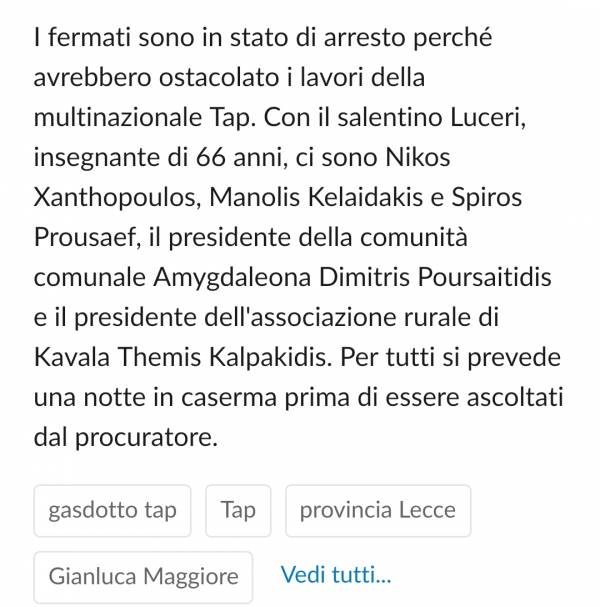 Ιταλικής εφημερίδας La Repubblica όπου με εκτενές ρεπορτάζ αναφέρεται στους συλληφθέντες με ειδική μνεία στον Ιταλό συμπαραστάτη της προσπάθειας για την αλλαγή της όδευσης του αγωγού φυσικού αερίου ΤΑΡ Υπάτιο Λουτσέρι.