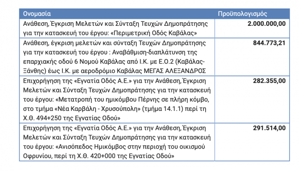 Πρόκειται, ειδικότερα, για μελέτες της Περιμετρικής Οδού Καβάλας, της διαπλάτυνσης της επαρχιακής οδού προς το Αεροδρόμιο «Μ.Αλέξανδρος», του κόμβου της Εγνατίας Οδού στην Πέρνη καθώς και του ημικόμβου της Εγνατίας Οδού στο Οφρύνιο.