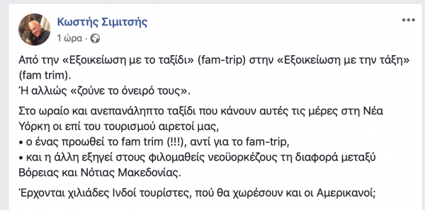 Ο κ. Σιμιτσής όμως σχολιάζει και την παρουσία του αντιπεριφερειάρχη Τουρισμού Κώστα Αντωνιάδη στη Νέα Υόρκη λέγοντας πως ο κ. Αντωνιάδης ζει το όνειρό του.