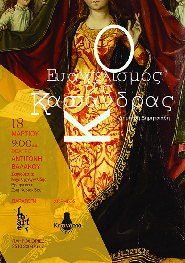 Το έργο του Δημήτρη Δημητριάδη «Ο Ευαγγελισμός της Κασσάνδρας» παρουσιάζεται στο θέατρο Αντιγόνη Βαλάκου, σε σκηνοθεσία Μιχάλη Αγγελίδη με τη Ζωή Κυριακίδου, την Τετάρτη 18 Μαρτίου στις 9 το βράδυ στο θέατρο Αντιγόνη Βαλάκου.